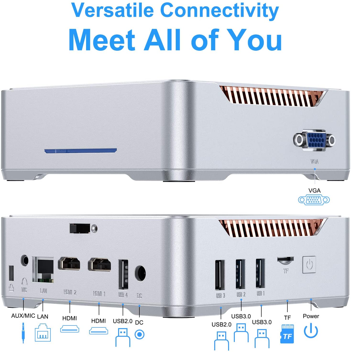 • [2.4/5G WIFI & Gigabit Ethernet] Mini Desktop Computer supports dual-band 2.4/5G WIFI, more stable and stronger signal. Also, can connect network with Gigabit Ethernet port.
