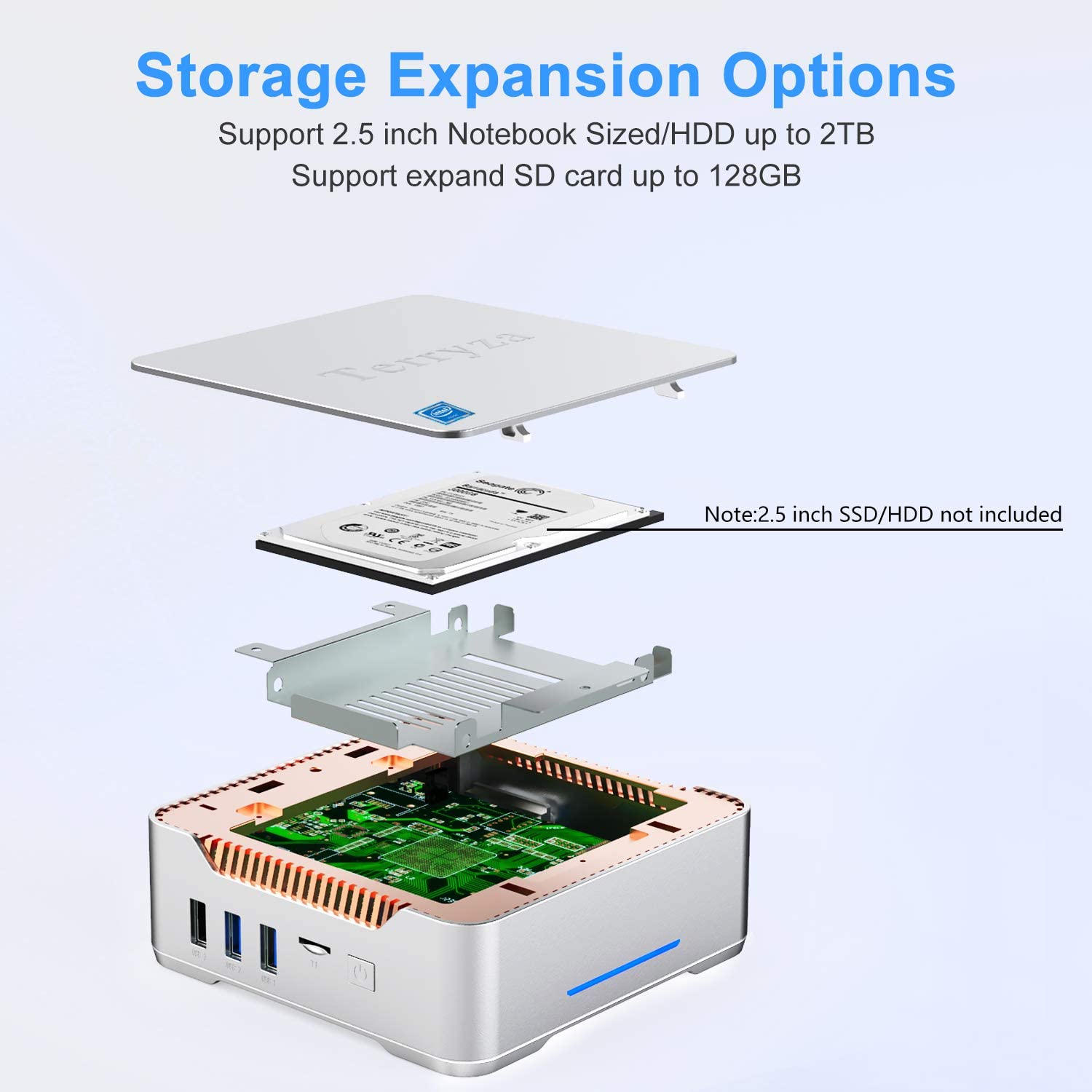 • [Large Storage & Expansion] The Mini Computer built-in 8GB DDR4, 128GB ROM (2.5-inch SATA SSD), has enough memory storage to run and save more files, movie. Also, you can add a SD card (up to 128GB), expand with external USB or M.2 NVME SSD to expand the storage.